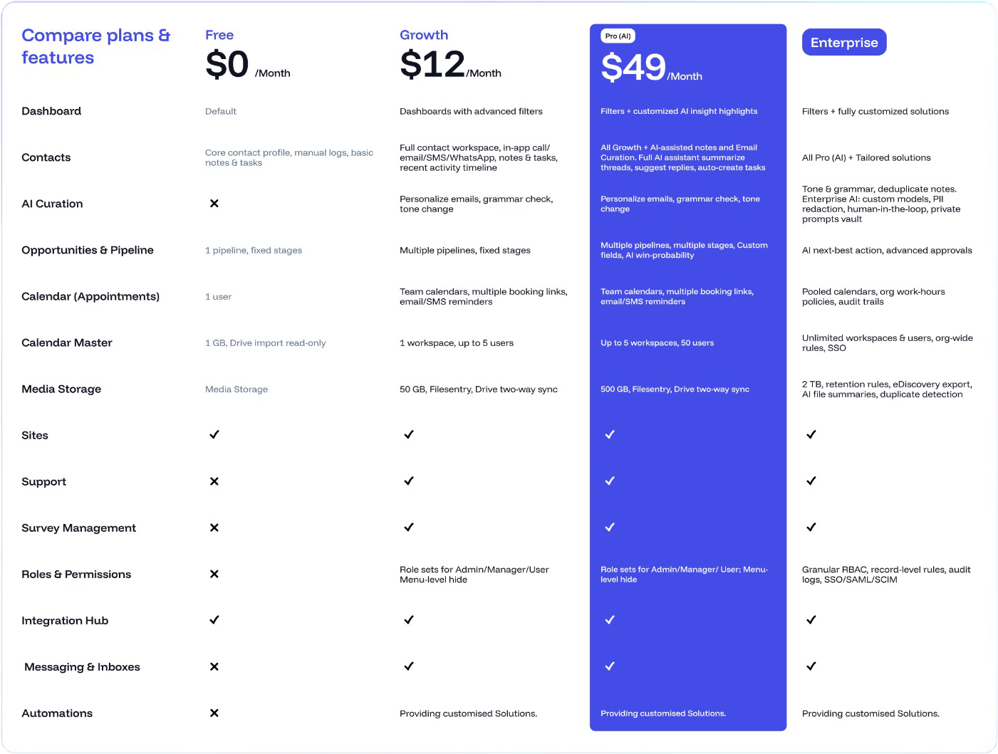 Choose a plan that fits your business today and scales as you grow. Access core CRM features, automation, and AI-driven insights in one unified platform.